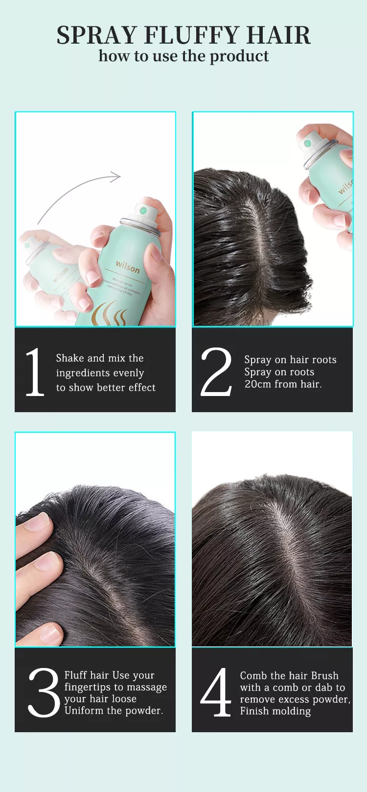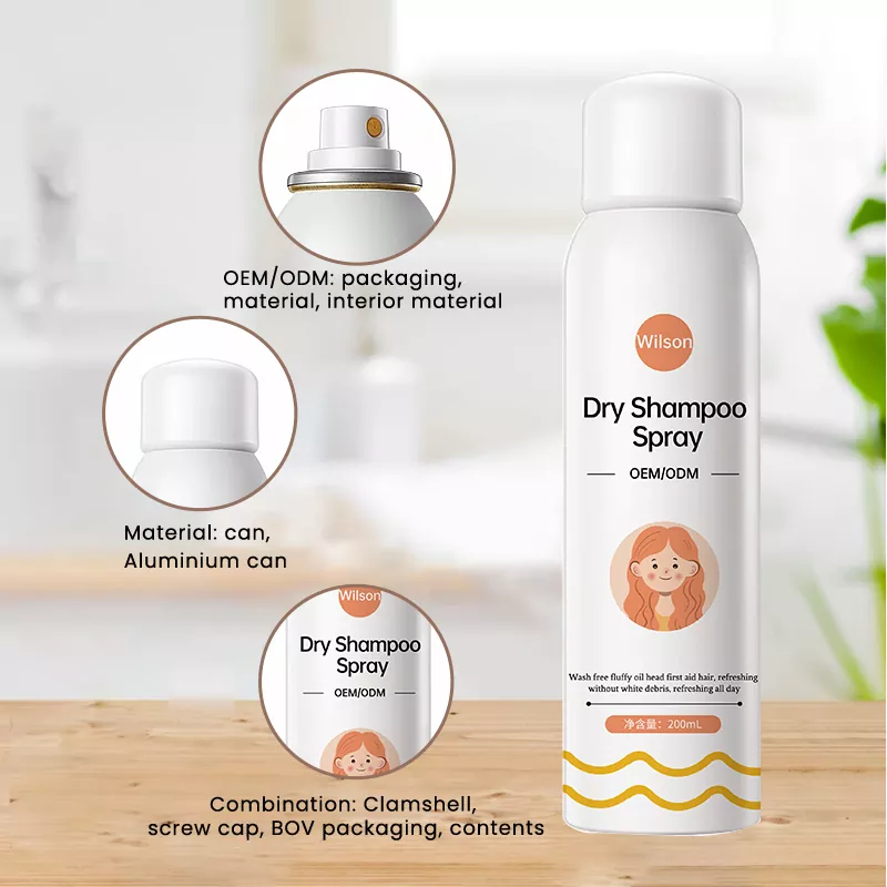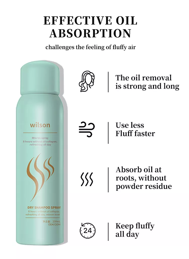 תרסיס שמפו יבש קריר ללא כביסה מיידי של Wilson על ידי הוספת גליצרין, טריגליצריד, ויטמין E, ויטמין B5 ושאר מרכיבי טיפוח השיער, כך שתזונה ולחות לשיער, למילוי הקשקשים והשיער עצמו חסרים מרכיבים, תוך השלמת שכבת שמן השיער, תיקון שחיקת נזקי שיער, הגנה על הראש מהסביבה החיצונית של השיער, ולבסוף ישיג את מטרת השיער הבריאה של מנוחה.