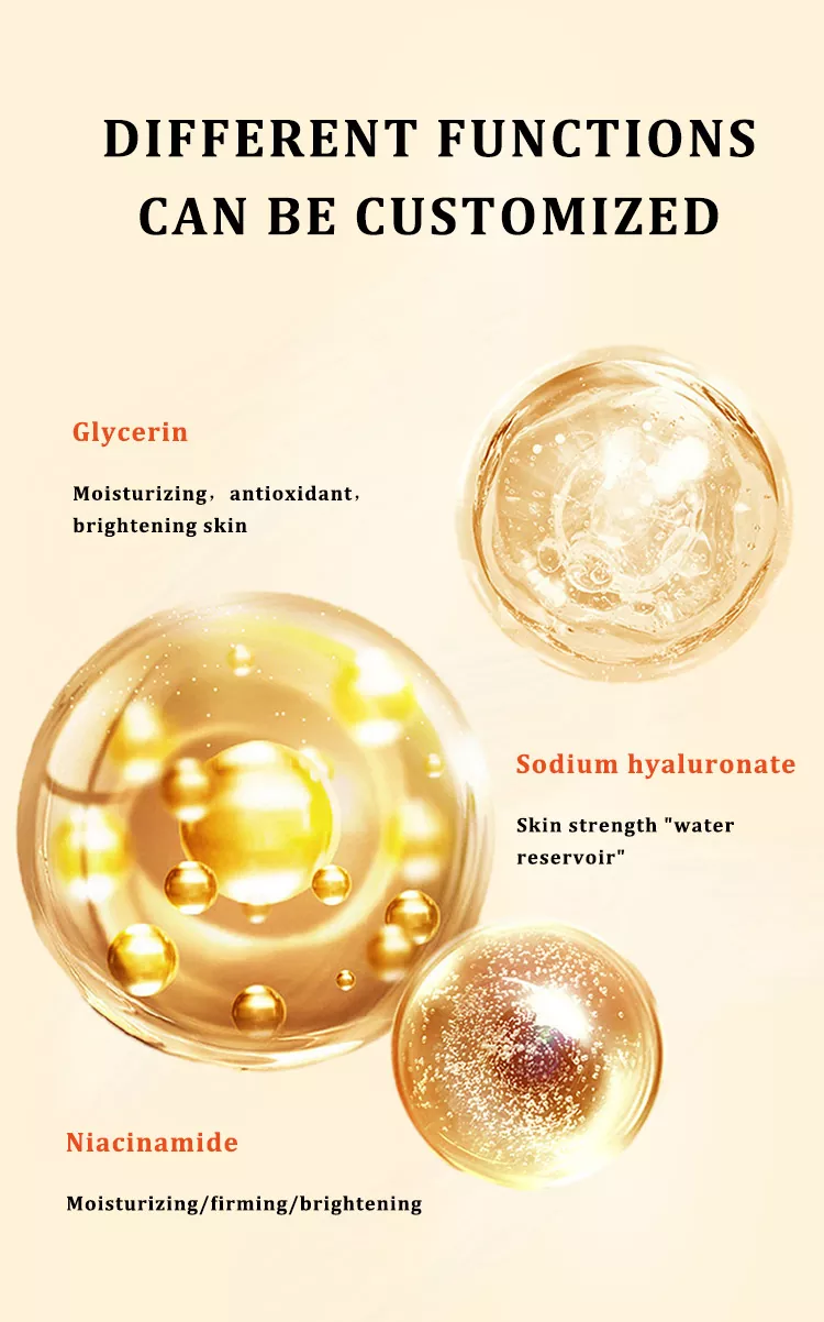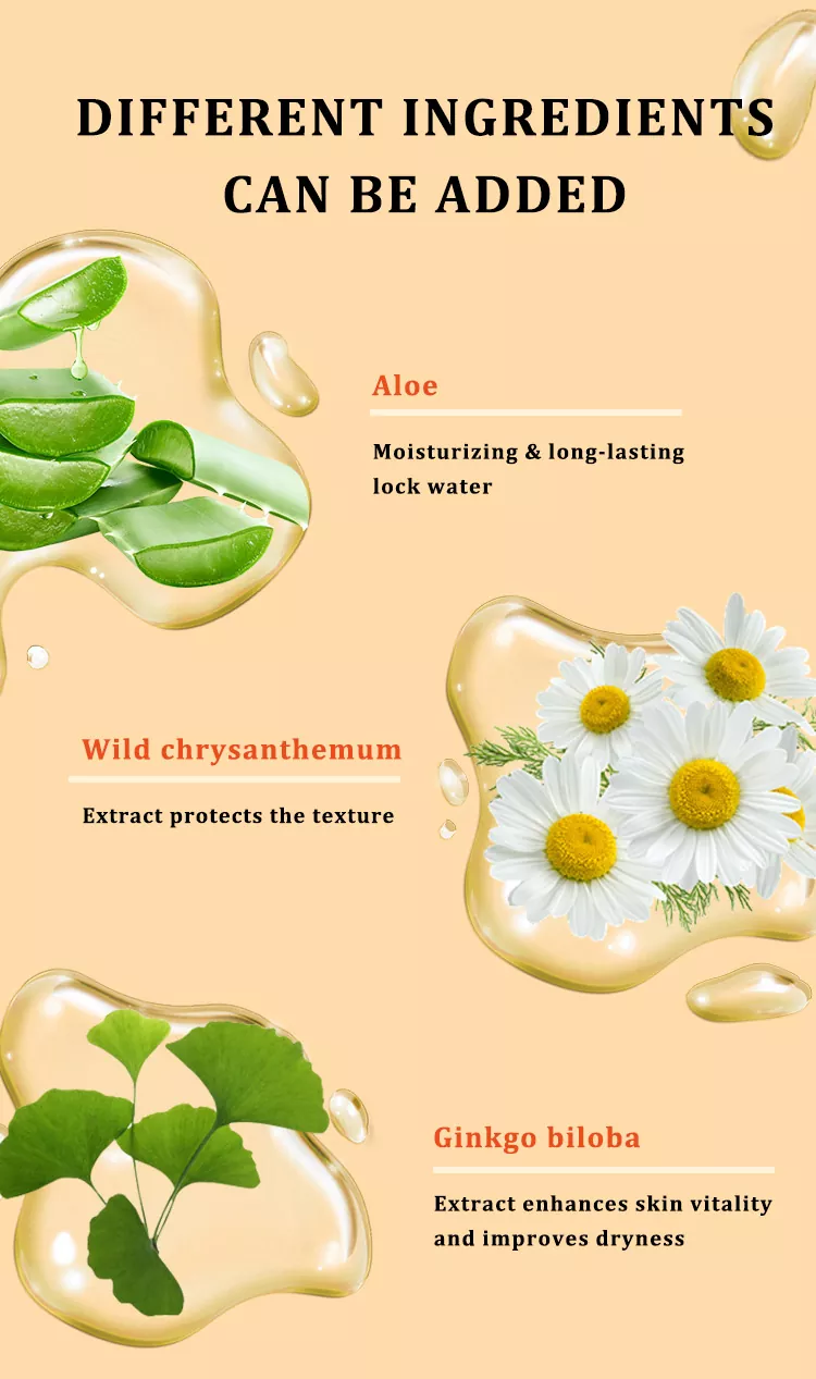 אנו יכולים גם להתאים אישית את הפורמולה הרצויה בהתבסס על המרכיבים הספציפיים של המוצר (למשל חומצה היאלורונית עיקרית, ניאצינמיד, ויטמין E, תמציות צמחים ספציפיות וכו'), ניחוח (למשל ורד, תה לבן, נטול ריח וכו'), והאם יש לו השפעות מיוחדות (למשל תיקון חזק, הלבנה, מיצוק וכו').